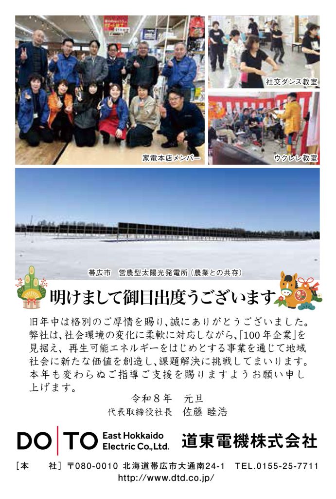 2026.01.01 お知らせ 2026年 明けましておめでとうございます 明けまして御目出度うございます。 旧年中は格別のご厚情を賜り、誠にありがとうございました。 弊社は、社会環境の変化に柔軟に対応しながら、「100年企業」を見据え、再生可能エネルギーをはじめとする事業を通じて地域社会に新たな価値を創造し、課題解決に挑戦してまいります。 本年も変わらぬご指導ご支援を賜りますようお願い申し上げます。 令和八年 元旦 代表取締役社長 佐藤 睦浩